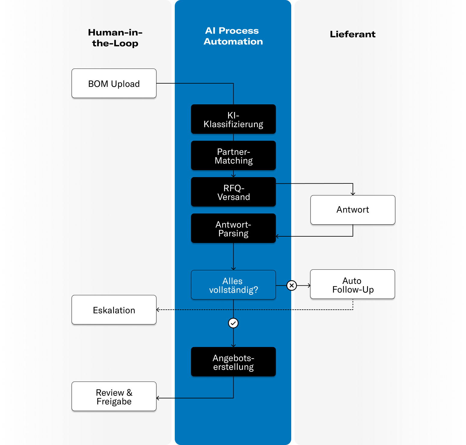 Effizienz. Die BOM-Klassifikation passiert jetzt beim Upload. Anfragen werden automatisch versendet, nachgefasst, ausgewertet. Menschen greifen an Entscheidungspunkten ein – nicht bei jedem einzelnen Schritt. Was früher einen Arbeitstag pro Projekt kostete, läuft heute im Hintergrund.