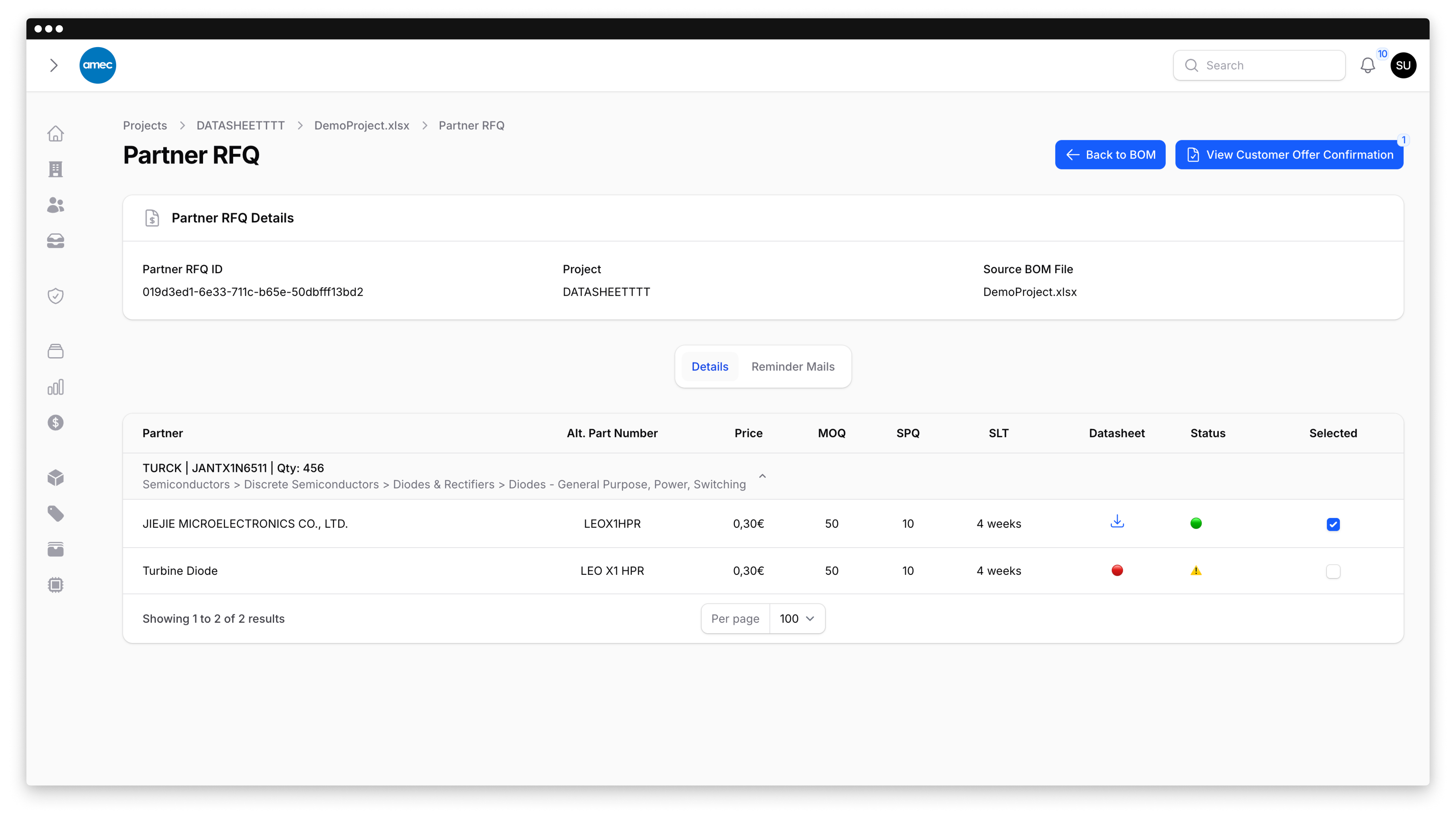 Bietet ein Partner ein Alternativbauteil an, legt das System automatisch eine Kreuzreferenz an. Angehängte Datenblätter werden erkannt, zugeordnet und abgelegt. Was früher in Köpfen und Postfächern steckte, wächst im DataKube zu einer durchsuchbaren Wissensbasis heran. Nutzer wählen die besten Angebote aus und stellen daraus ein Kundenangebot zusammen – mit voller Rückverfolgbarkeit bis zum ursprünglichen BOM-Eintrag.