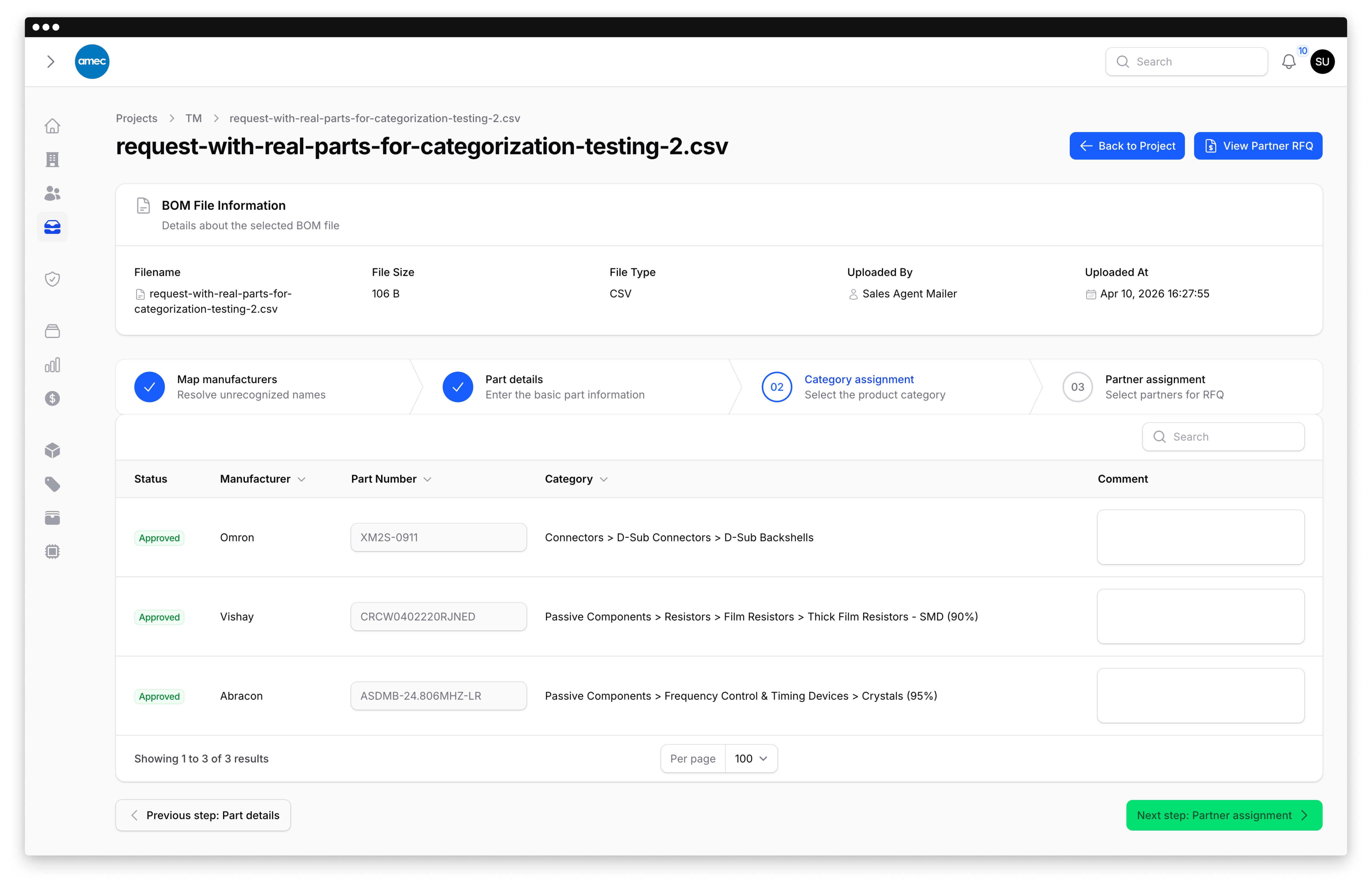 Skalierung und Profitabilität. Das Beschaffungswissen von amec wächst kumulativ in der Plattform: Part Crossings, Partnerfähigkeiten, Datenblätter, Preishistorie. Eine Kreuzreferenz vom Januar steht im März allen zur Verfügung. Das senkt den Aufwand pro Anfrage dauerhaft – und verbessert die Marge, weil Entscheidungen auf besserer Datenbasis getroffen werden.