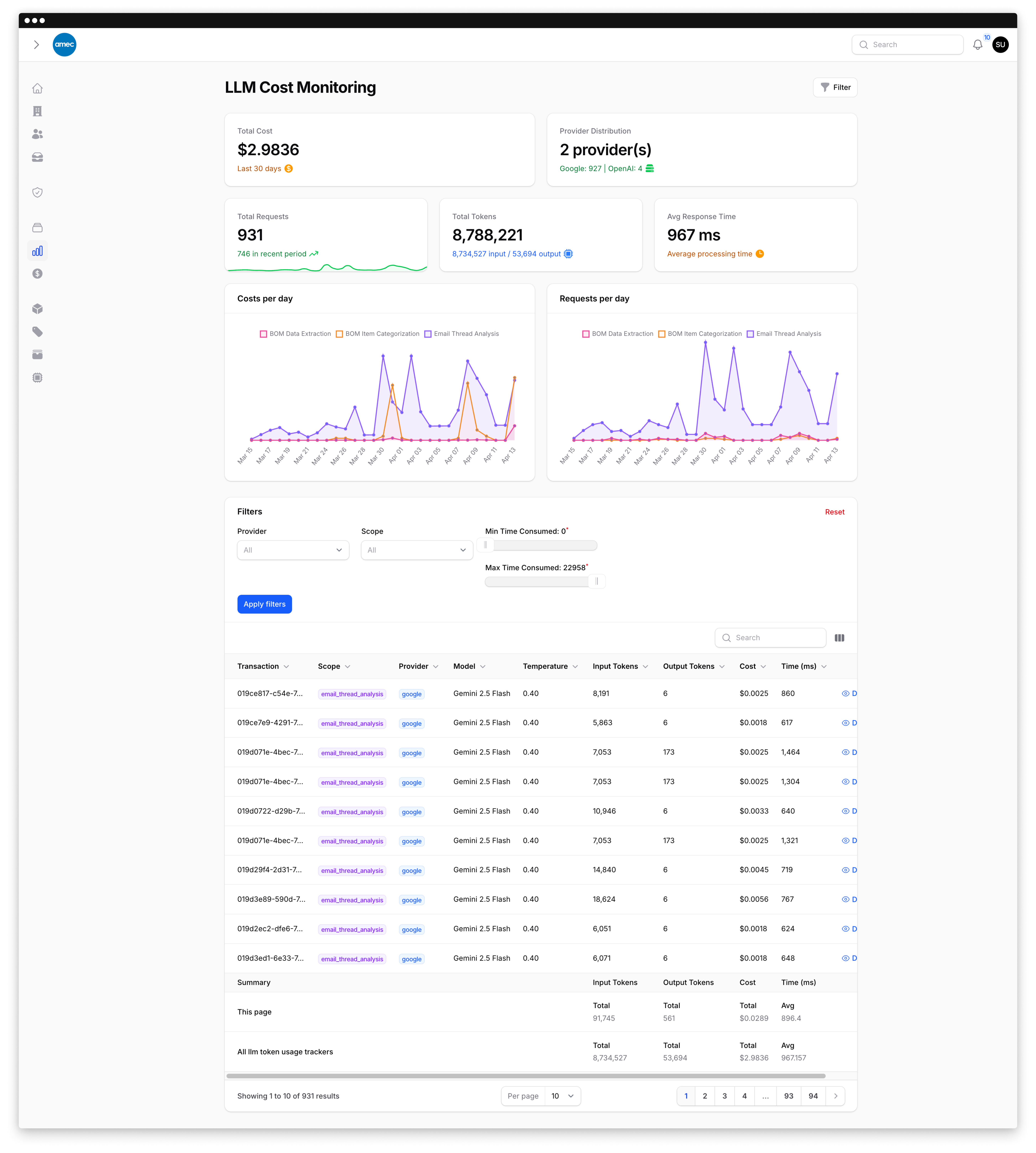 Jeder LLM-Call wird getrackt: nach Modell, Anwendungsfall und Volumen. Das schafft Transparenz und ermöglicht gezielte Optimierung – damit AI auch dann wirtschaftlich bleibt, wenn das Beschaffungsvolumen wächst.