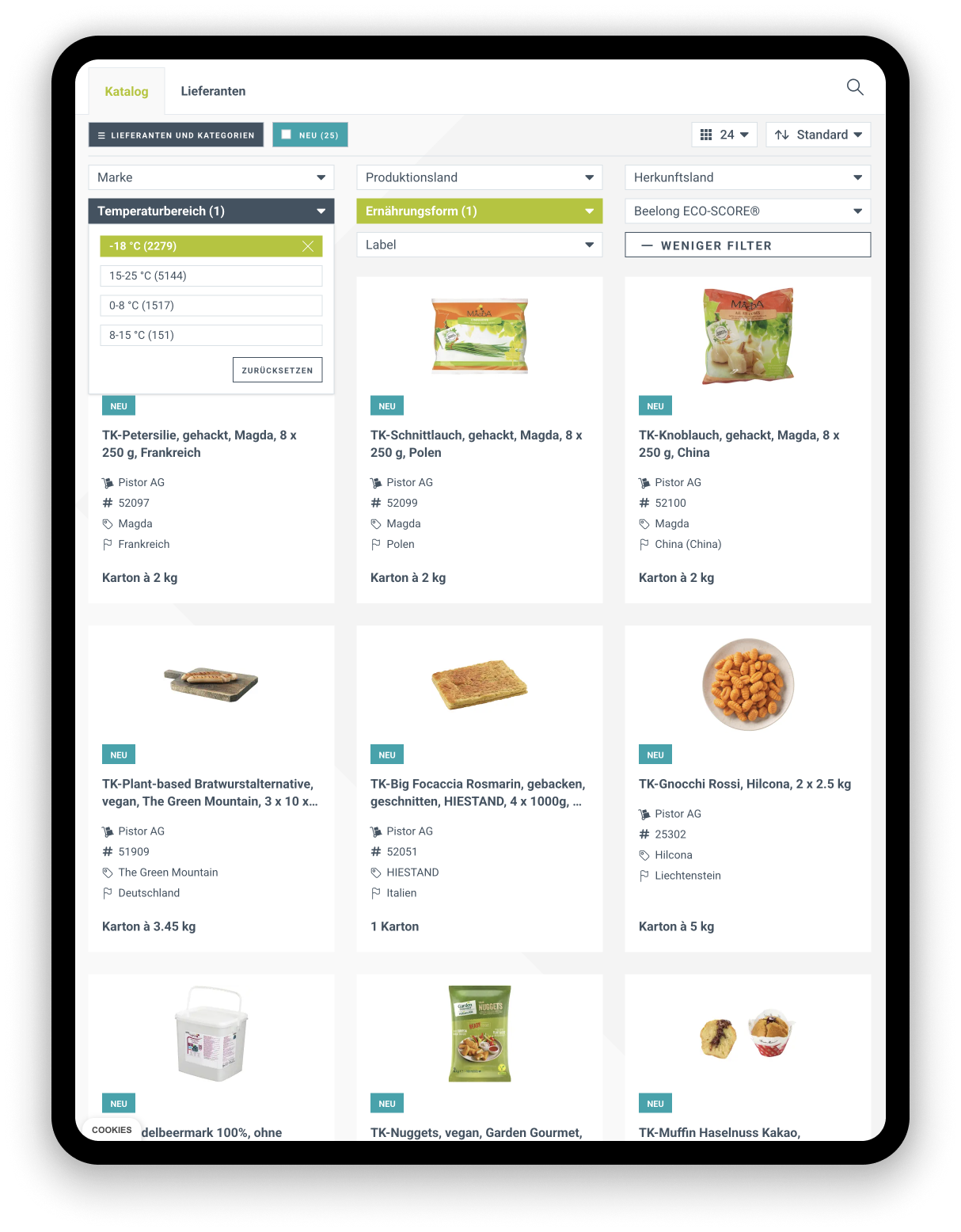 Gesamt- und Lieferant:innenkatalog: Überblick über alle verfügbaren Produkte oder gezielte Ansicht bei bestimmten Lieferant:innen