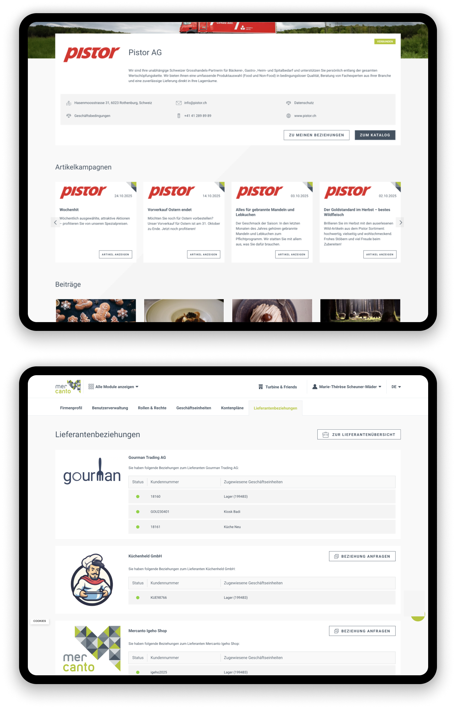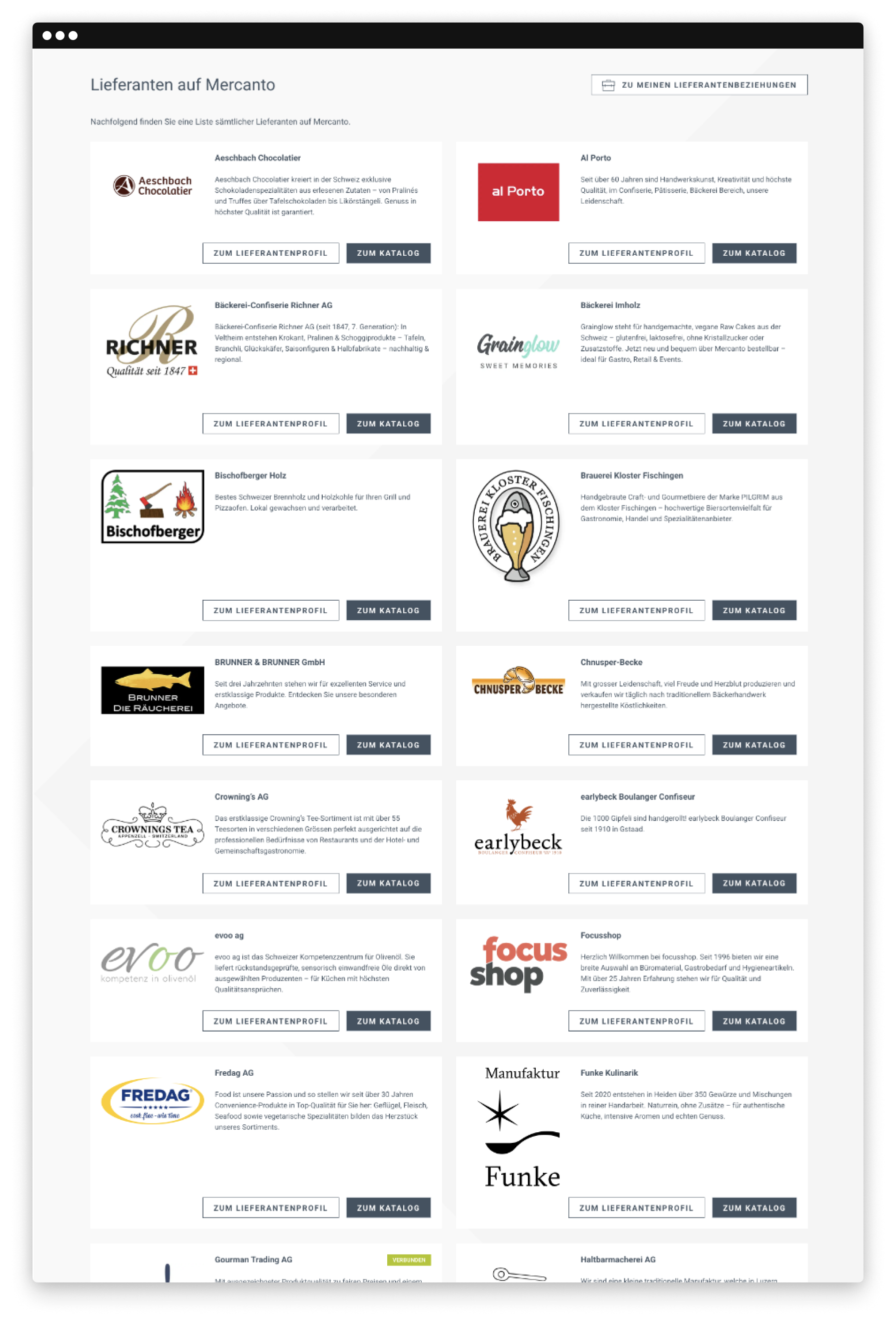 Auf Mercanto präsentieren sich Lieferant:innen mit eigenem digitalen »Schaufenster« und individueller Sortiments- und Preisgestaltung. Die Plattform garantiert volle Datensouveränität, bietet wirksame Marketing-Tools und direkten Zugang zu potenziellen Neukund:innen. Ein eigens entwickeltes Lieferantenportal erlaubt wertvolle Geschäftseinblicke – ideal für regionale Spezialisten wie internationale Großanbieter.